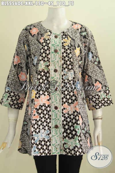 Juragan Baju Batik Online, Sedia Blus Batik Jumbo Kombinasi Dua Warna, Baju Batik Wanita Gemuk Model Tanpa Kerah Motif Proses Cap Cocok Untuk Kerja Tampil Elegan [BLS5560C-XXL]