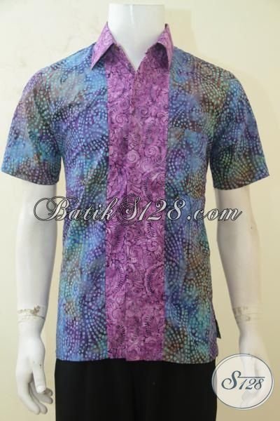 Kemeja Baju Batik Cap Smoke Warna Gradasi Kombinasi Ungu, Batik Berkwalitas Model Lengan Pendek Pas Buat Ke Kantor [LD4234CS-M , XL]