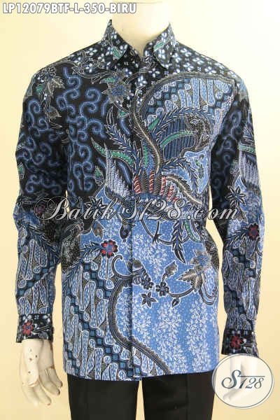 Kemeja Batik Biru Motif Mewah Kombinasi Tulis, Busana Batik Lengan Panjang Solo Full Furing, Istimewa Buat Kerja Dan Rapat [LP12079BTF-L]