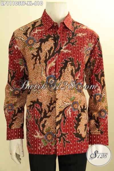 Kemeja Batik Kerja Kantoran Pria Lengan Panjang Warna Merah Motif Elegan Tulis Asli, Pakaian Batik Premium Full Furing Khas Jawa Tengah, Menunjang Penampilan Makin Sempurna [LP11103TF-XL]