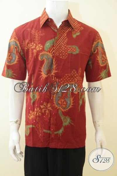 Kemeja Batik Lengan Pendek Halus Dan Adem, Batik Baju Kerja Warna Merah Motif Unik Trend Masa Kini, Pakaian Batik Solo Proses Tulis Soga Kwalitas Premium [LD4059TS-L]