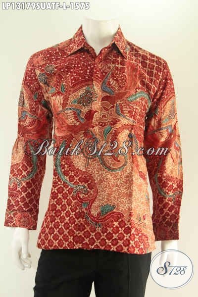 Kemeja Batik Pria Berbahan Sutra ATBM Warna Merah Lengan Panjang Full Furing, Motif Terbaru Nan Elegan Proses Tulis Pas Banget Untuk Kerja Dan Rapat [LP13179SUATF-L]