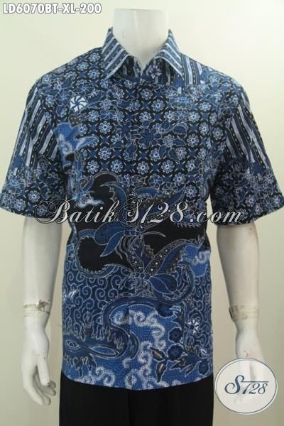 Kemeja Batik Warna Biru Model Lengan Pendek, Pakaian Batik Halus Istimewa Proses Kombinasi Tulis, Baju Batik Istimewa Buatan Solo Elegan Buat Kondangan Dan Acara Resmi [LD6070BT-XL]