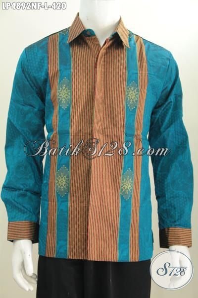 Kemeja Tenun Warna Biru Kombinasi Garis Coklat Berbahan Halus Model Lengan Panjang Dengan Daleman Full Furing Keren Dan Nyaman Di Pakai [LP4892NF-L]