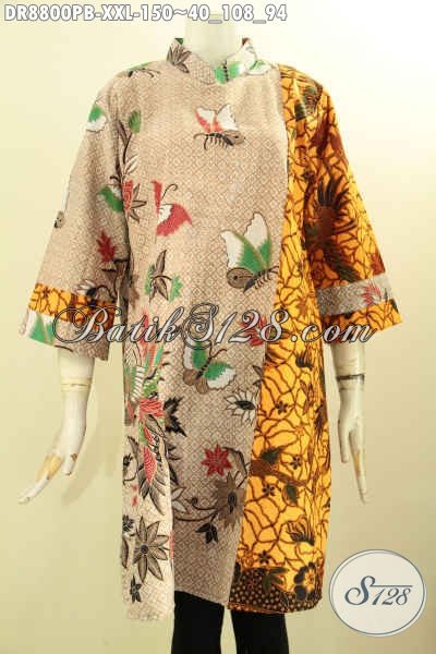 Koleksi Busana Batik Wanita Gemuk Terkini Untuk Penampilan Lebih Berkelas, Dress Batik Lengan 7/8 Dual Motif Pakai Kerah Shanghai Dan Resleting Belakang Asli Solo [DR8800PB-XXL]