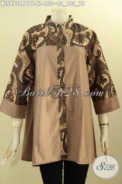 Koleksi Busana Batik Wanita Nan ELegan, Blouse Batik Solo Modis Kerah Shanghai Lengan 3/4 Bahan Paduan Kain Batik Dan Katun Polos Toyobo, Tampil Cantik Mempesona [BLS8739PBTY-XL]