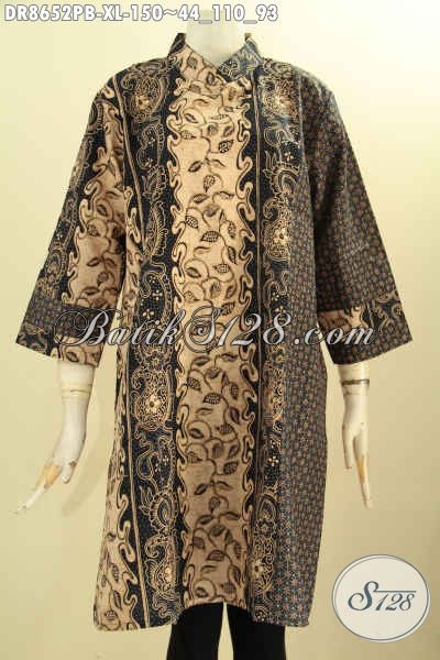 Koleksi Busana Batik Wanita Terbaru, Tunik Batik Dress Lengan 7/8 Kerah Shanghai Bahan Adem Motif Klasik Kantong Dalem Dan Resleting Belakang, Pas Buat Acara Resmi [DR8652PB-XL]