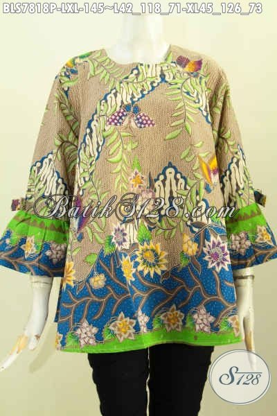 Koleksi Terbaru Blus Batik Jawa Tengah, Pakaian Batik Khas Solo Trendy Tanpa Krah Dengan Lengan Berpita, Tampil Gaya Dan Cantik [BLS7818P-L , XL]