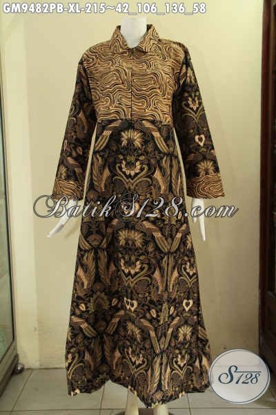 Koleksi Terbaru Gamis Batik Solo Dengan Kombinasi 2 Motif, Pakaian Batik Modern Model Kerah Bulat Pakai Resleting Depan, Penampilan Terlihat Cantik Berkelas [GM9482PB-XL]