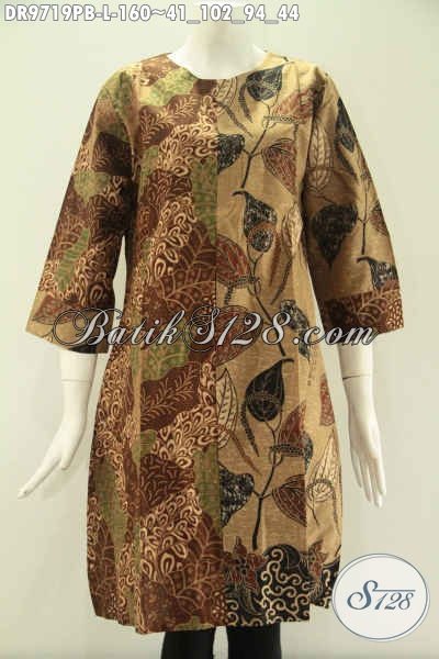 Model : Dress Batik Kombinasi 2 Motif, Tanpa Kerah, Resleting Belakang, Lengan 7/8