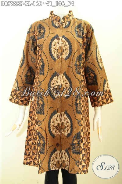 Koleksi Terkini Baju Dress Batik Solo, Busana Batik Terusan Kombinasi 2 Motif Klasik Model Krah Shanghai, Cewek Terlihat Anggun Dan Menawan [DR7883P-XL]