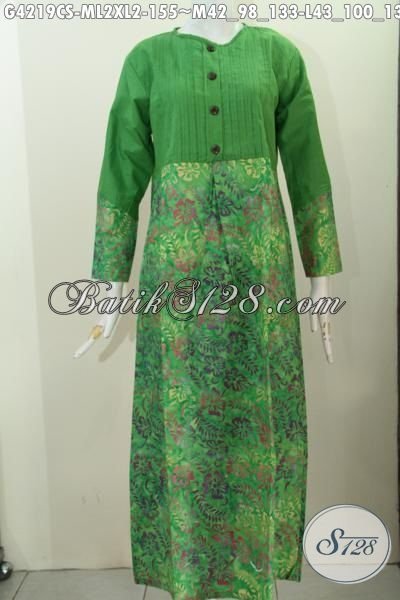 Long Dress Batik Warna Hijau Motif Unik Proses Cap Smoke, Gamis Batik Trendy Buat Wanita Muda Dan Dewasa Terlihat anggun Mempesona [G4219CS-XL]
