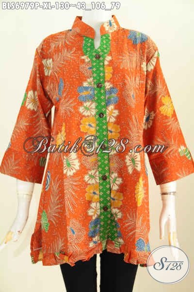 Model Baju Atasan Batik Wanita Kerja 2018, Blus Keren Warna Orange Lengan 3/4 Ofneisel Rempel, Penampilan Makin Gaya [BLS6979P-XL]
