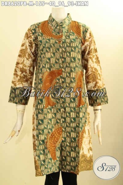 Model Baju Batik Kerja Wanita Muda Nan Keren Dan Istimewa, Hadir Dengan Kerah Shanghai Lengan 7/8 Dan Kancing Depan, Motif Ikan Proses Printing Cabut Hanya 100 Ribuan [DR8620PB-M]