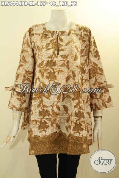Model Baju Batik Solo Istimewa, Buana Batik Blus Keren Desain A Dengan Resleting Depan Dan Lengan Berpita Berpadu Motif Berkelas Proses Printing Cabut, Tampil Cantik Anggun [BLS8446PB-XL]
