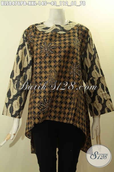 Model Baju Batik Wanita Kombinasi, Blouse Batik ELegan Dengan Bagian Belakang Lebih Panjang Dari Depan, Busana Batik Kerja Wanita Gemuk Lengan Tumpuk Kancing Belakang Hanya 145K [BLS8476PB-XXL]