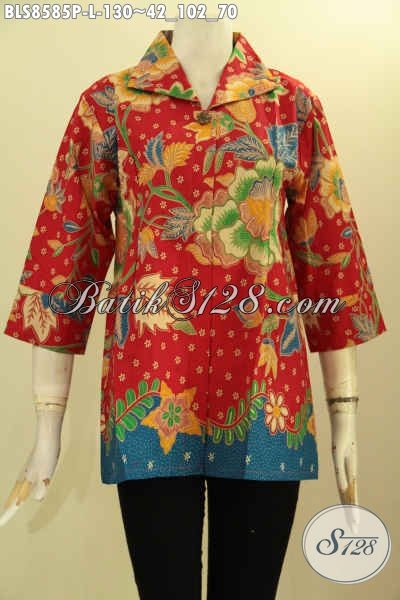 Model Baju Batik Wanita Warna Merah Lengan 7/8, Kemeja Batik Blouse Krah Pakai Kancing Depan Motif Bunga Proses Printing Harga 130K [BLS8585P-L]