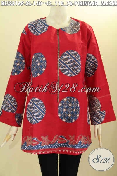 Model Baju Kemeja Batik Bluse Tanpa Krah Warna Merah Motif Piringan Proses Printing, Pakaian Batik Modis Lengan Panjang Resleting Depan Dan Kantong Paspol Kanan Kiri Di Pinggang Tren Masa Kini [BLS8616P-XL]