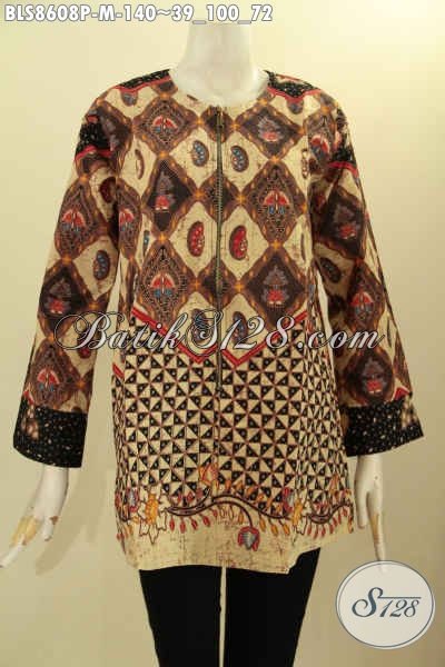 Model Batik Kemeja Blouse Wanita Muda Lengan Panjang Resleting Depan, Busana Batik Kerja Kantong Paspol Kanan Kiri Di Pinggang Untuk Penampilan Lebih Gaya [BLS8608P-M]
