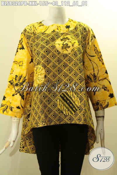 Model Busana Batik Blus Wanita Gemuk Yang Kekinian, Baju Batik Bagian Depan Lebih Pendek Dari Belakang Dengan Lengan Tumpuk, Bahan Halus Motif Keren Printing Cabut Hanya 155K [BLS8326PB-XXL]