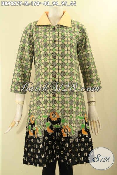 Model Busana Batik Dress Asli Solo, Pakaian Batik Elegan Dengan Kerah Polos Pakai Kancing Depan Dan Lengan 7/8, Tampil Anggun Menawan [DR9327P-M]