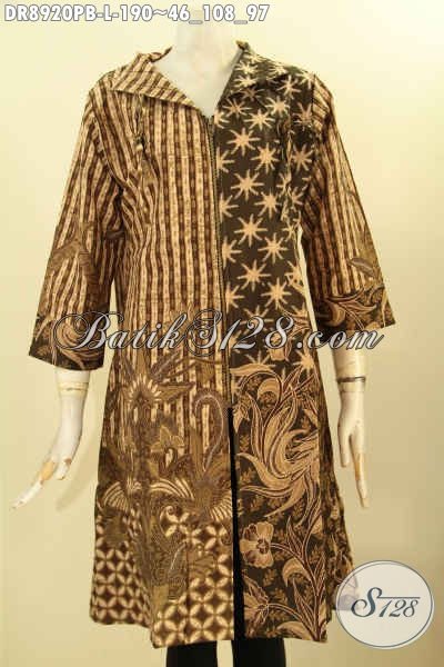 Model Busana Batik Kerja Wanita Kantoran, Dress Batik Solo Asli Lengan 3/4 Kerah Langsung Dengan Aksesoris Di Bagian Dada Kanan Kiri, Tampil Gaya Dan Kekinian [DR8920PB-L]