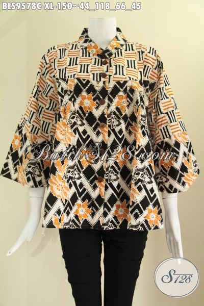 Olshop Baju Batik Terpercaya, Jual Blouse Batik Modern 2 Motif Model Kerah Shanghai Kancing Depan Lengan 7/8 Bahan Halus Nyaman Di Pakai [BLS9578C-XL]