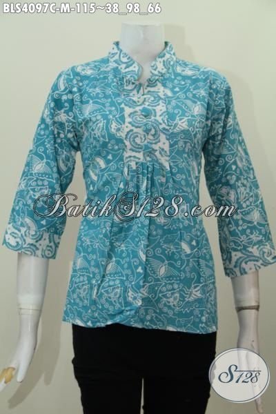 Pakaian Batik Blus Modern Warna Biru Model Kerah Shanghai, Baju Batik Lengan Pendek Istimewa Proses Cap Asli Buatan Solo [BLS4097C-M]