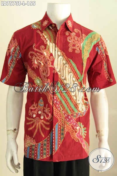 Pakaian Batik Cowok Warna Merah Motif Trendy Proses Tulis Bahan Adem Yang Nyaman Di Pakai, Model Lengan Pendek Size L [LD7573T-L]
