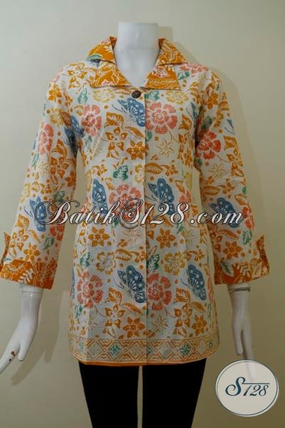 Pakaian Batik Dasar Putih Motif Kuning Dengan Model Trendy Terbaru, Baju Blus Batik Formal Untuk Seragam Ke Kantor Cewek Karir Aktif [BLS2027C-L]