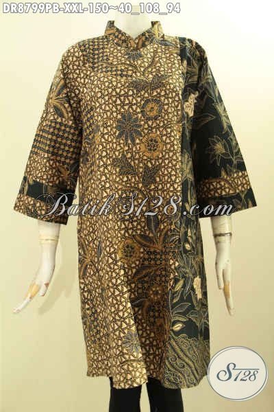 Pakaian Batik Dress Nan Elegan Khas Jawa Tengah, Busana Batik Modern Solo Tren Masa Kini Kwalitas Bagus Bahan Adem Desain Kerah Shanghai Lengan 7/8 Resleting Belakang 100 Ribuan Saja [DR8799PB-XXL]
