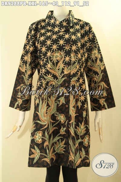 Pakaian Batik Kerja Wanita Karir, Busana Batik Solo Istimewa Kerah Miring Lengan 7/8, Dress Batik Istimewa Spesial Untuk Wanita Gemuk Di Lengkapi Kancing Depan, Tampil Cantik Menawan [DR9288PB-XXL]