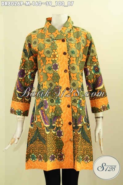 Pakaian Batik Modis Motif Bunga, Dress Batik Krah Miring Dengan Nuansa Hijau Berkelas, Pakaian Batik Printing Solo Kwalitas Bagus Harga Terjangkau [DR8026P-M]