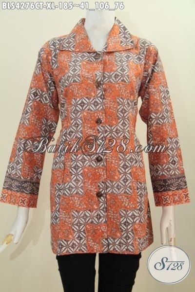 Pakaian Batik Trendy Warna Orange Dengan Motif Unik Dan Menarik Cocok Untuk Pesta Dan Hangout, Baju Blus Batik Cap Tulid Formal Modis Juga Untuk Kerja [BLS4276CT-XL]