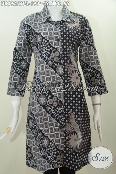 Pakaian Batik Wanita Karir Terbaru Model Kerah Lancip Berbahan Halus Kombinasi Tulis Asli Buatan Solo, Batik Dress Jawa Berkelas Tampil Cantik Maksimal [DR3925BT-L]