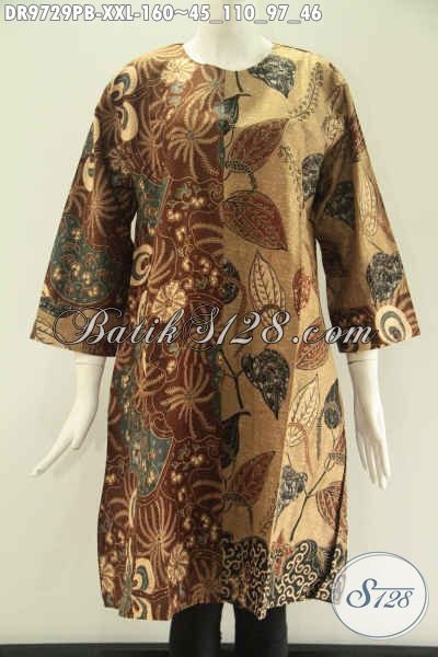 Pakaian Batik Wanita Tren Model Terbaru Spesial Buat Yang Berbadan Gemuk, Baju Batik Kombinasi 2 Motif Tanpa Kerah Kwalitas Bagus Yang Di Lengkapai Resleting Belakang Lengan 7/8, Bisa Untuk Santai Maupun Resmi [DR9729PB-XXL]