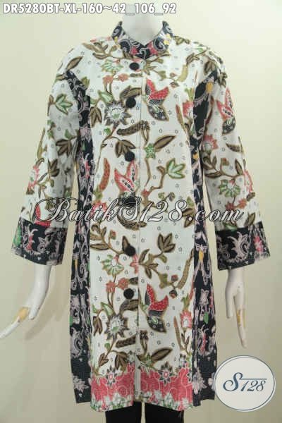 Pakaian Dress Batik Terusan Proses Kombinasi Tulis, Baju Batik Kerah Paspol Shanghai Bahan Adem Kwalitas Istimewa Untuk Penampilan Anggun Mempesona [DR5280BT-XL]