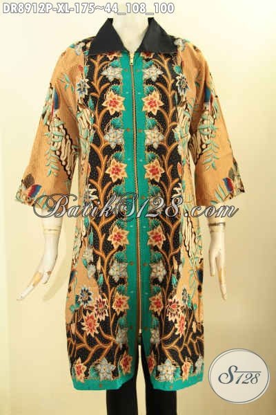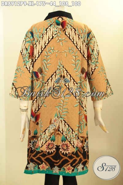Produk Baju Batik Cewek Motif Terbaru Nan Mewah, Busana Batik Dress Elegan Model Lengan 3/4 Resleting Depan Kombinasi Kerah Kain Polos, Cocok Banget Untuk Acara Resmi [DR8912P-XL]
