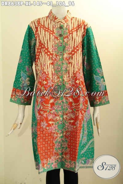 Produk Baju Batik Terbaru Yang Membuat Penampilan Cantik Menawan, Tunik Batik Dress Elegan Motif Bagus Desain Lengan 7/8 Kerah Shanghai Kancing Depan Hanya 145K [DR8638P-XL]