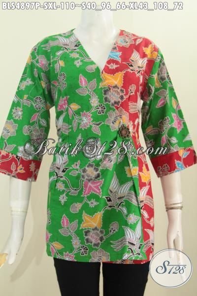 Produk Baju Batik Terkini Buat Wanita Karir, Pakaian Batik Printing Kombinasi Dua Warna Model Kimono Bahan Halus Harga 110K [BLS4897P-S , XL]