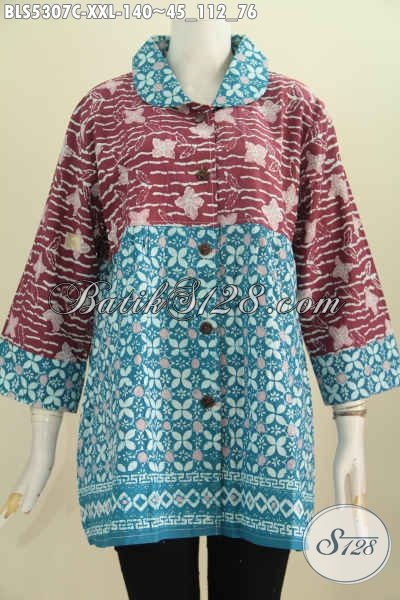 Produk Baju Batik Wanita Dual Warna Dan Motif, Pakaian Batik Blus Kerah Bulat Nan Istimewa Proses Cap Yang Bikin Wanita Gemuk Tampil Gaya Mempesona [BLS5307C-XXL]