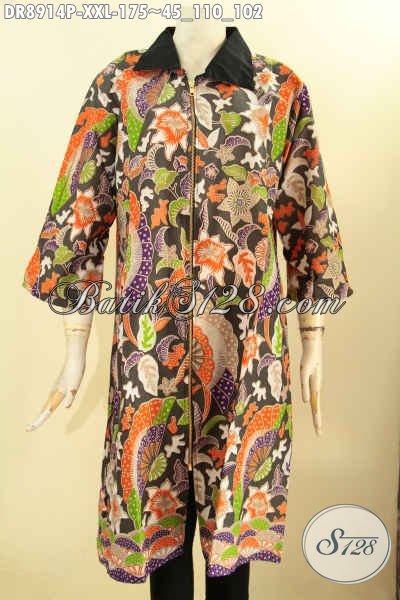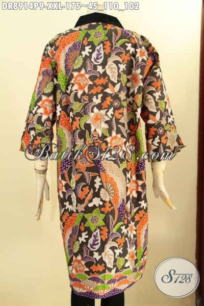 Produk Busana Batik Koleksi Terkini Spesial Untuk Wanita Gemuk, Pakaian Batik Modern Lengan 3/4 Motif Keren Proses Printing, Dress Batik Resleting Depan Kerah Polos, Penampilan Lebih Menawan [DR8914P-XXL]
