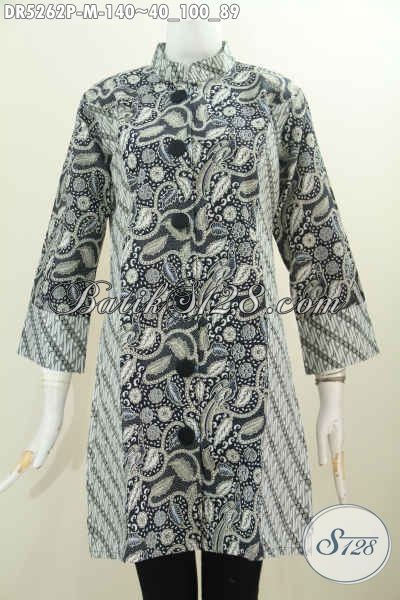 Produk Busana Batik Untuk Kerja, Baju Dress Terusan Berbahan Halus Motif Kombinasi Dengan Kerah Paspol Shanghai Tampil Elegan Berkelas [DR5262P-M]