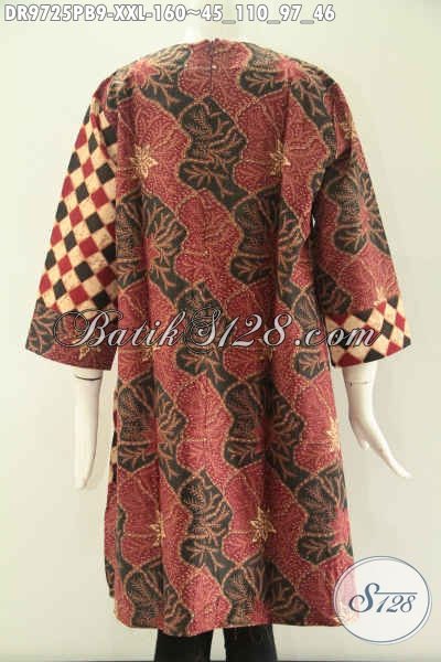 Produk Busana Batik Wanita Gemuk Tren Masa Kini Kombinasi 2 Motif Model Tanpa Kerah, Pakaian Batik Kekinian Yang Di Lengkapi Resleting Belakang Lengan 7/8 Modis Bisa Buat Ke Kondangan [DR9725PB-XXL]