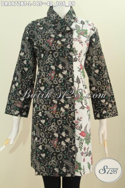 Produk Busana Batik Wanita Terkini, Baju Batik Kerja Model Dress Istimewa Berbahan Halus Kombinasi Dua Motif Dan Warna Proses Kombinasi Tulis Model Kerah Miring Tampil Mewah Harga Murah [DR4972BT-L]