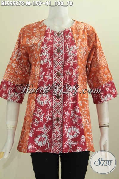 Produk Busana Batik Wanita Terkini, Baju Blus Model Tanpa Kerah Dengan Kombinasi Dua Warna Proses Cap Pas Buat Jalan-Jalan Atau Seragam Kerja [BLS5537C-M]