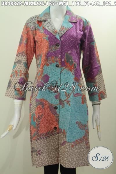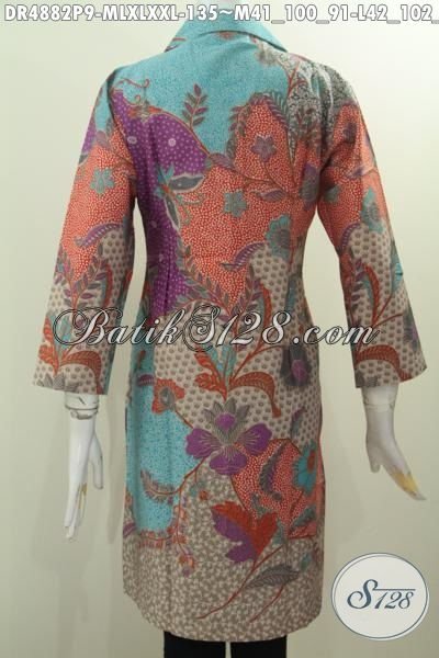 Produk Pakaian Batik Elegan Untuk Wanita Terkini, Busana Batik Berkelas Model Kerah Safari Bahan Halus Motif Mewah Proses Printing Warna Pagi Sore Harga 100 Ribuan [DR4882P-L]