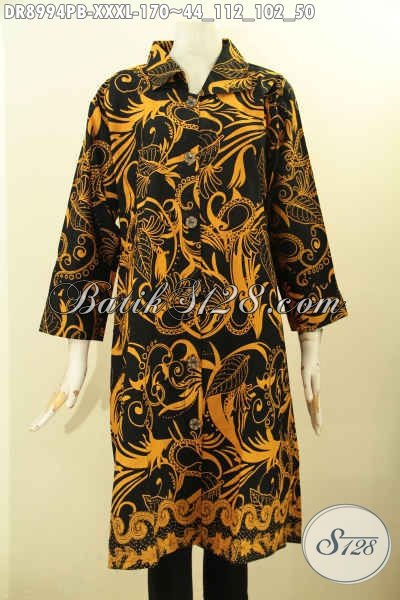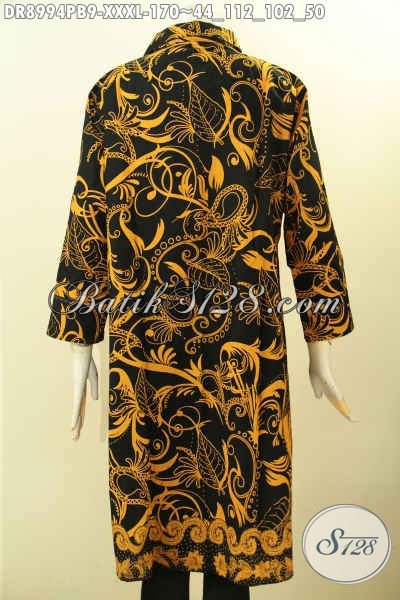Pusat Baju Batik Solo Online, Jual Dress Kerah Lengan 7/8 Kancing Depan Bahan Halus Motif Bagus Untuk Kerja Dan Acara Resmi Proses Printing Cabut, Spesial Buat Wanita Gemuk Karir Aktif [DR8994PB-XXXL]