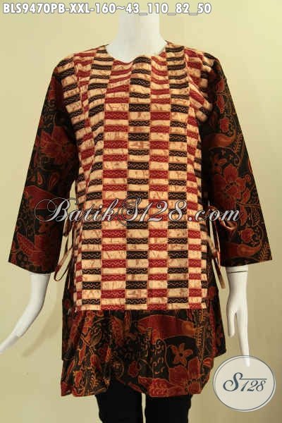 Pusat Baju Batik Solo Online Terlengkap Dan Up To Date, Sedia Blouse Batik Jumbo Kombinasi 2 Motif Model Resleting Belakang Lengan 7/8 Bertali Di Bagian Kanan Kiri, Spesial Buat Wanita Gemuk [BLS9470PB-XXL]