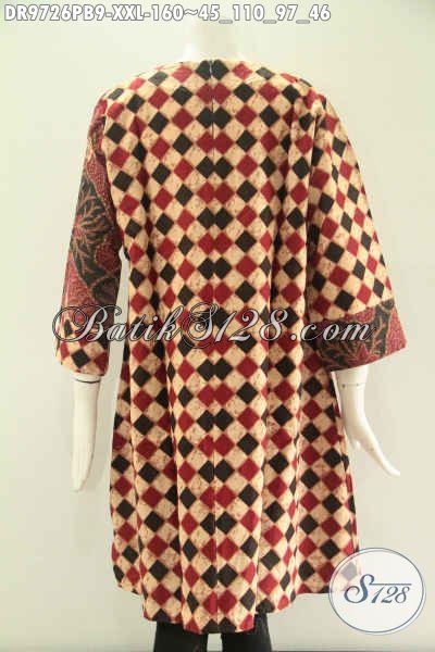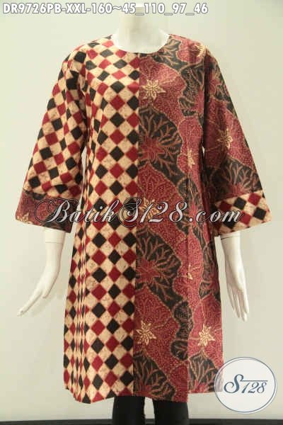 Sedia Baju Batik Jumbo Lengan 7/8, Dress Batik Kombinasi 2 Motif Model Tanpa Kerah Pakai Resleting Belakang Berbahan Halus Yang Nyaman Di Pakai, Spesial Buat Wanita Gemuk [DR9726PB-XXL]